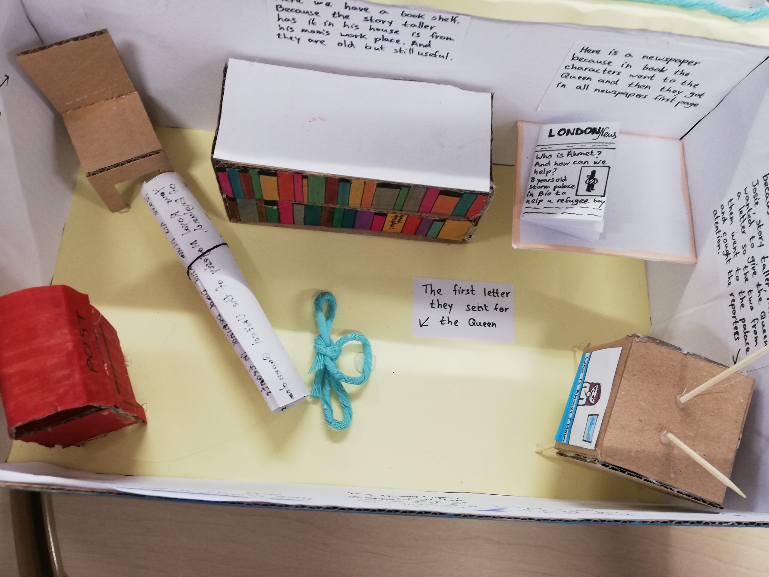Wie schaffe ich es, die Handlung einer Geschichte in einem einfachen Karton bzw. in einem Foto aufleben zu lassen? Mit dieser Frage beschäftigten sich die Schülerinnen und Schüler des 7. Jahrgangs im Fach Englisch. Nachdem sie sich aus einer Auswahl an englischsprachigen Büchern für ihr Lieblingsbuch entschieden, begannen sie damit, das ausgewählte Buch zunächst einmal zu lesen. Schon während des Lesens markierten sich die Schülerinnen und Schüler wichtige Handlungspunkte, Zitate und spannende Lesepassagen, die sie in das anschließende Kreativprojekt einfließen ließen. Hierbei ging es darum, Situationen der Handlung des Buches entweder komprimiert, mithilfe eines Schuhkartons („Book in a Box“), oder aber anhand eines Fotos („Book Bento“) darzustellen.
