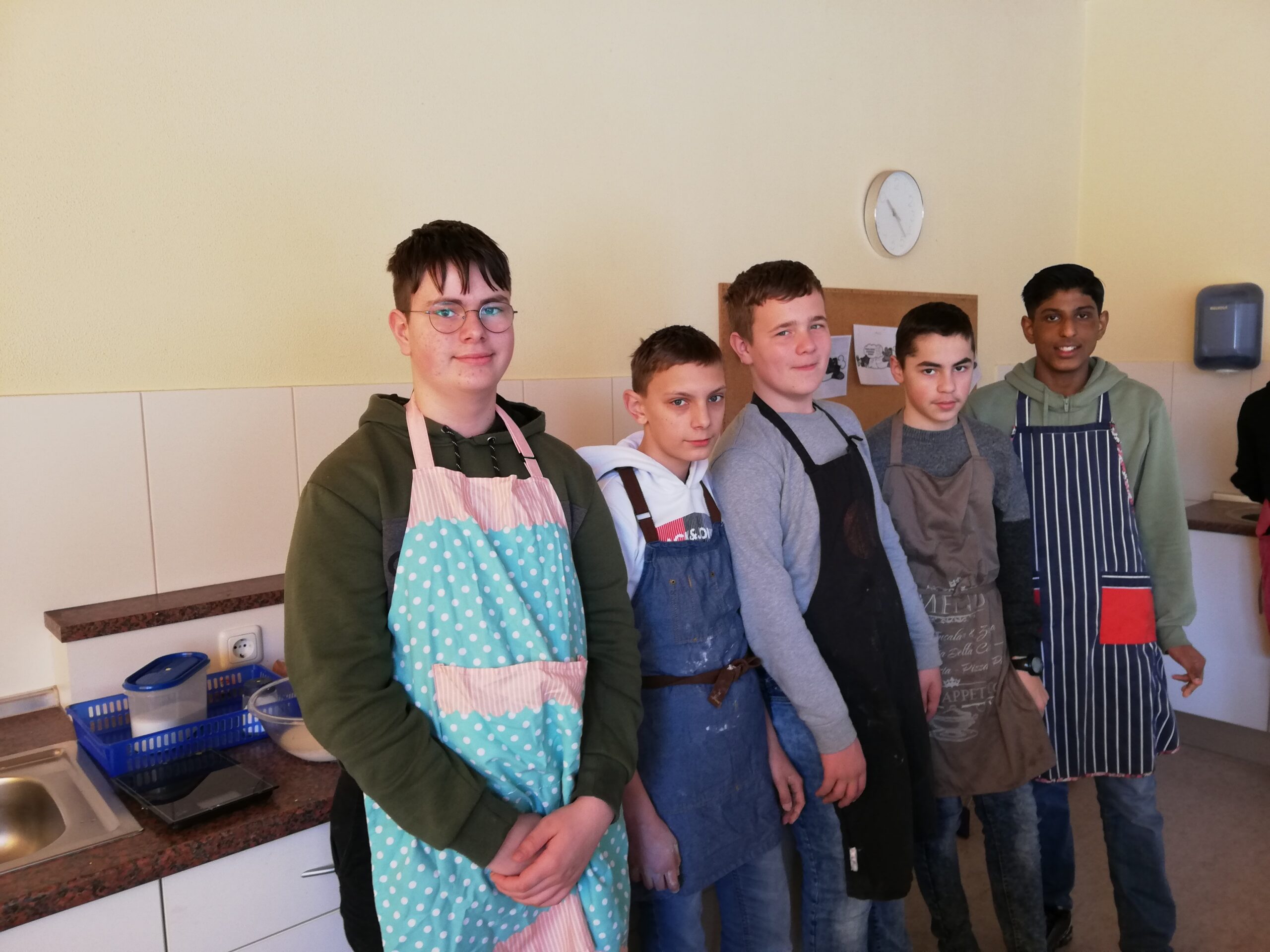 Zum Abschluss der Unit „Scotland“ machten sich die Schülerinnen und Schüler des Englischunterrichts (Jahrgang 7) daran, das typische schottische Teegebäck Scones zu backen. Hierzu teilten sie sich in drei Gruppen auf und nahmen die Küchenzeilen schnell in Beschlag. Nachdem das englischsprachige Rezept durchgearbeitet wurde, dauerte es nicht lange, bis alle Zutaten und Utensilien zusammengesucht wurden und der Backmarathon beginnen konnte. Hierbei zeigte sich, dass es manchmal besser ist, sich an die genauen Angaben zu halten und „ein bisschen hiervon, ein bisschen davon“ eben nicht immer zum gewünschten Ergebnis führt: „Oh no, it’s too much milk in there!“ 🙂 ) Trotz einiger herausfordernder Momente, ließ sich die Klasse 7c nie aus der Ruhe bringen und zauberte mehrere Bleche leckerer Scones, die im Anschluss mit Butter, Marmelade und Honig verzerrt wurden.