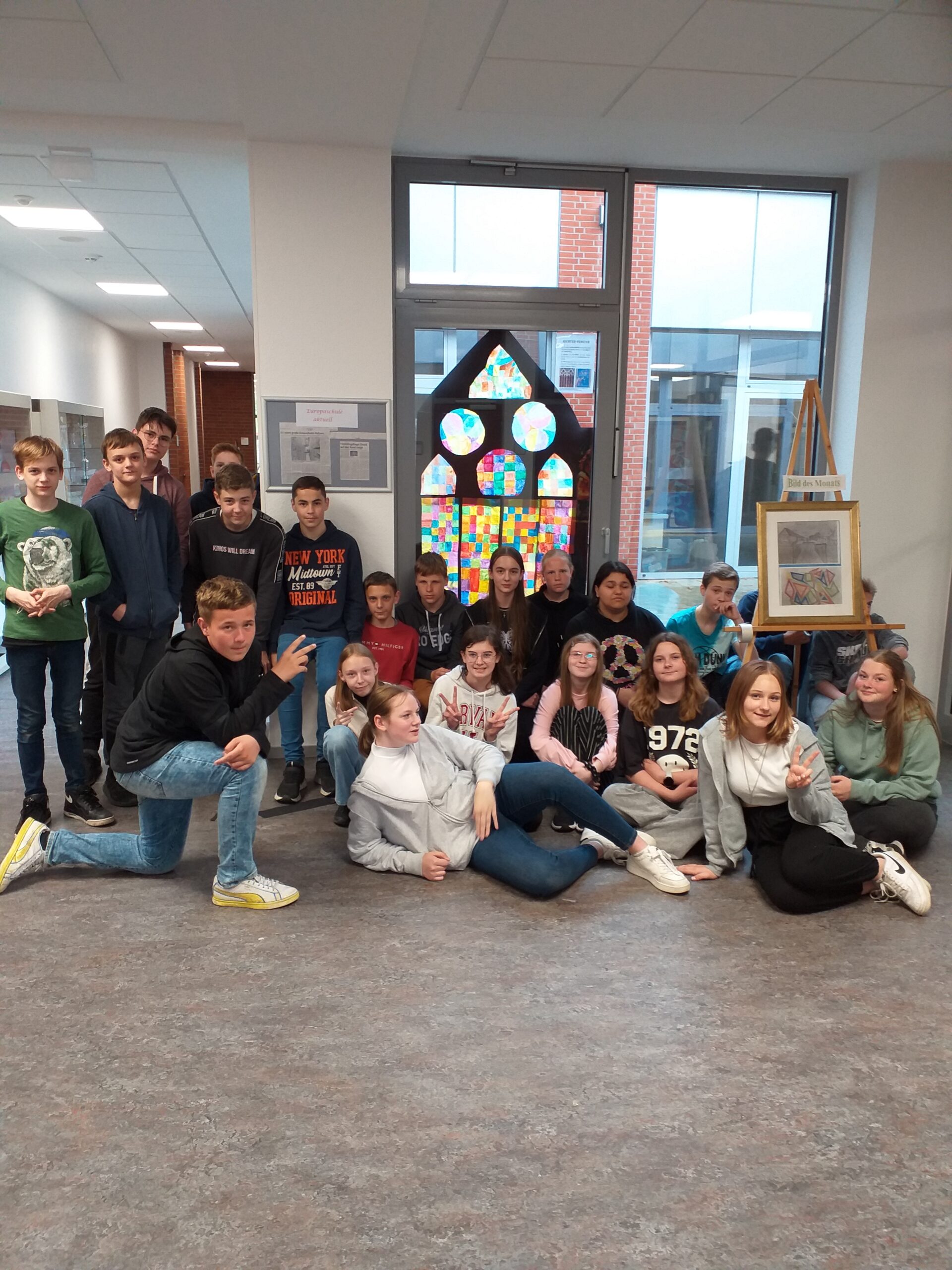 Die Klasse 7c beschäftigte sich im Kunstunterricht mit dem Maler Gerhard Richter. Dieser hat ein Fenster im Kölner Dom durch das Zufallprinzip gestaltet. Für das Zufallsbild belegten die Schüler:innen die Zahlen eines Würfels mit Farben und zeichneten auf Transparentpapier so die einzelne Elemente des Fensters. In der heutigen Stunde wurde nun ein Fenster im Stil der Gothik aus den Einzelelementen zusammengesetzt.