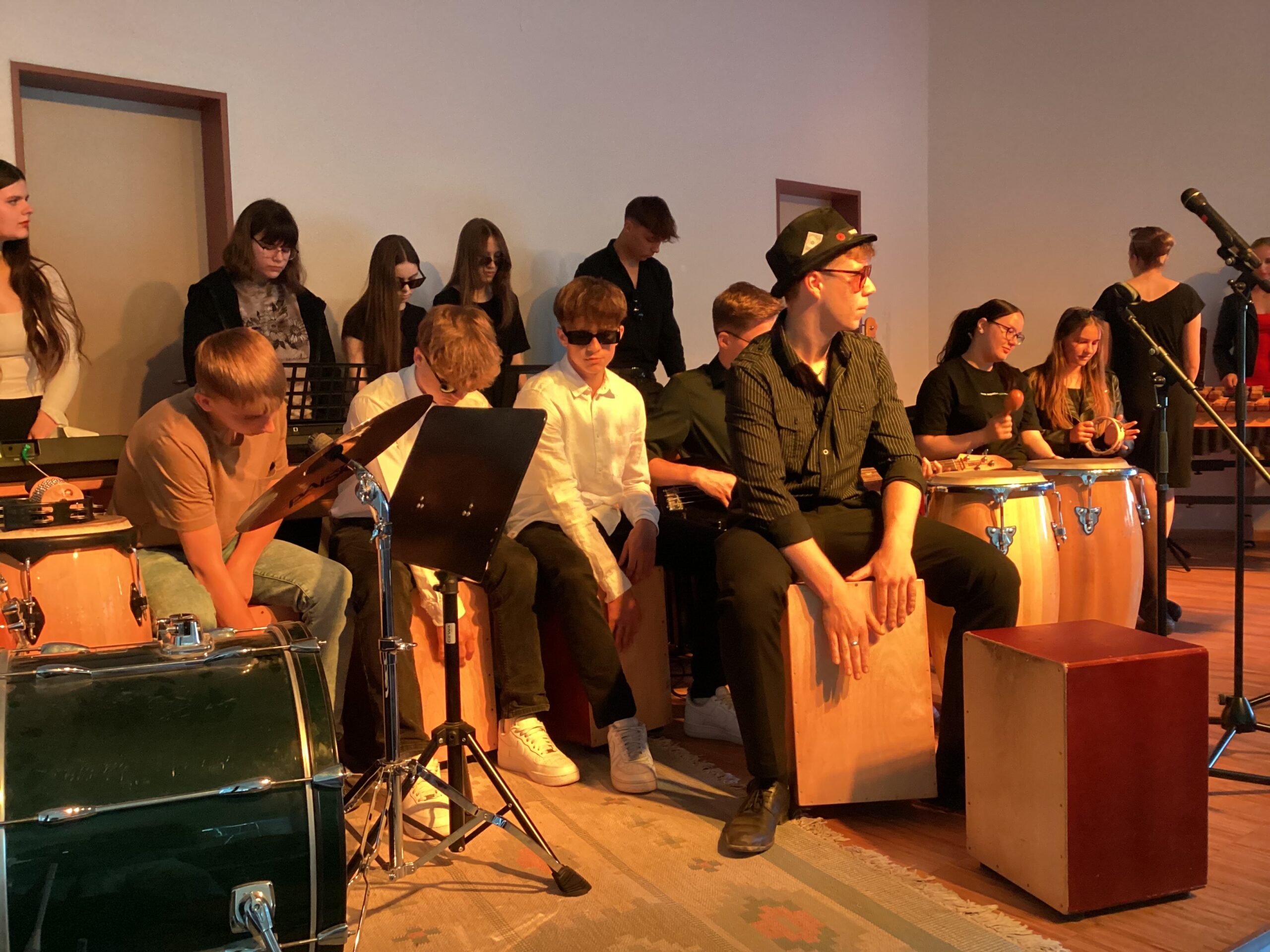 Große Aufregung herrschte heute in der Aula, das Lampenfieber war spürbar. Die Schüeler:innen Klasse 10 waren schick gekleidet, weil sie in ihrer Mottowoche als VIP verkleidet waren. Alle Klassen die in diesem Halbjahr Musikunterricht hatten, spielten ihre Beiträge vor. Unterstützt wurden sie von dem Chor und der Bläsergruppe. Die Musiklehrerinnen können mächtig stolz auf ihre Musikklassen sein.