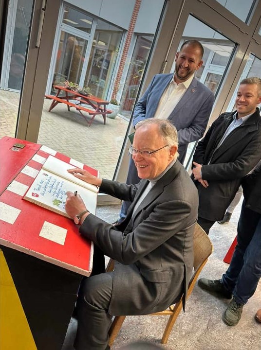 Bei seinem Besuch in Molbergen am Montag Nachmittag kam der Ministerpräsident Stephan Weil auch bei uns in der Schule vorbei. Er informierte sich über die Arbeitsweise an unserer Schule, lobte die positive Atmosphäre, bewunderte die vielen Auszeichnungen und ließ sich erklären, wie Projektzeit, Wettbewerbszeit oder Lernbüro funktioniert. Die Schülerfirma hat ein Büffet vorbereitet unter dem Motto „Molberger Tapas“. Herr Weil zeigte sich begeistert, wie lecker dies war und war sehr angetan von den Blätterteigröllchen mit Grünkohl.