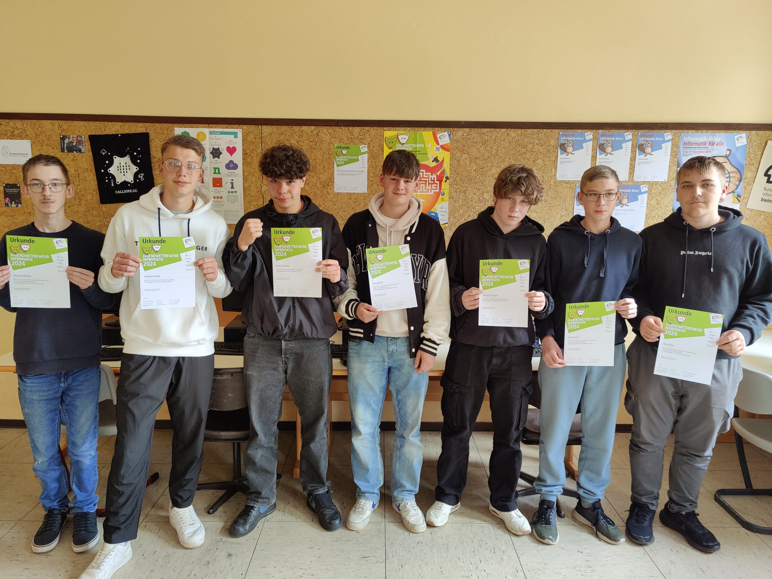Hervorgehend aus dem Informatikunterricht fand sich eine Gruppe von 15 Schülern aus den Jahrgängen 8 und 9, die sich selbstständig während einer wöchentlichen Übungszeit unter Anleitung von Frau Böckmann mit dem algorithmischen Problemlösen auseinandersetzten. Sie stellten sich dabei der Herausforderung, am bundesweiten Jugendwettbewerb Informatik teilzunehmen und acht von ihnen erreichten die Stufe der Anerkennung.