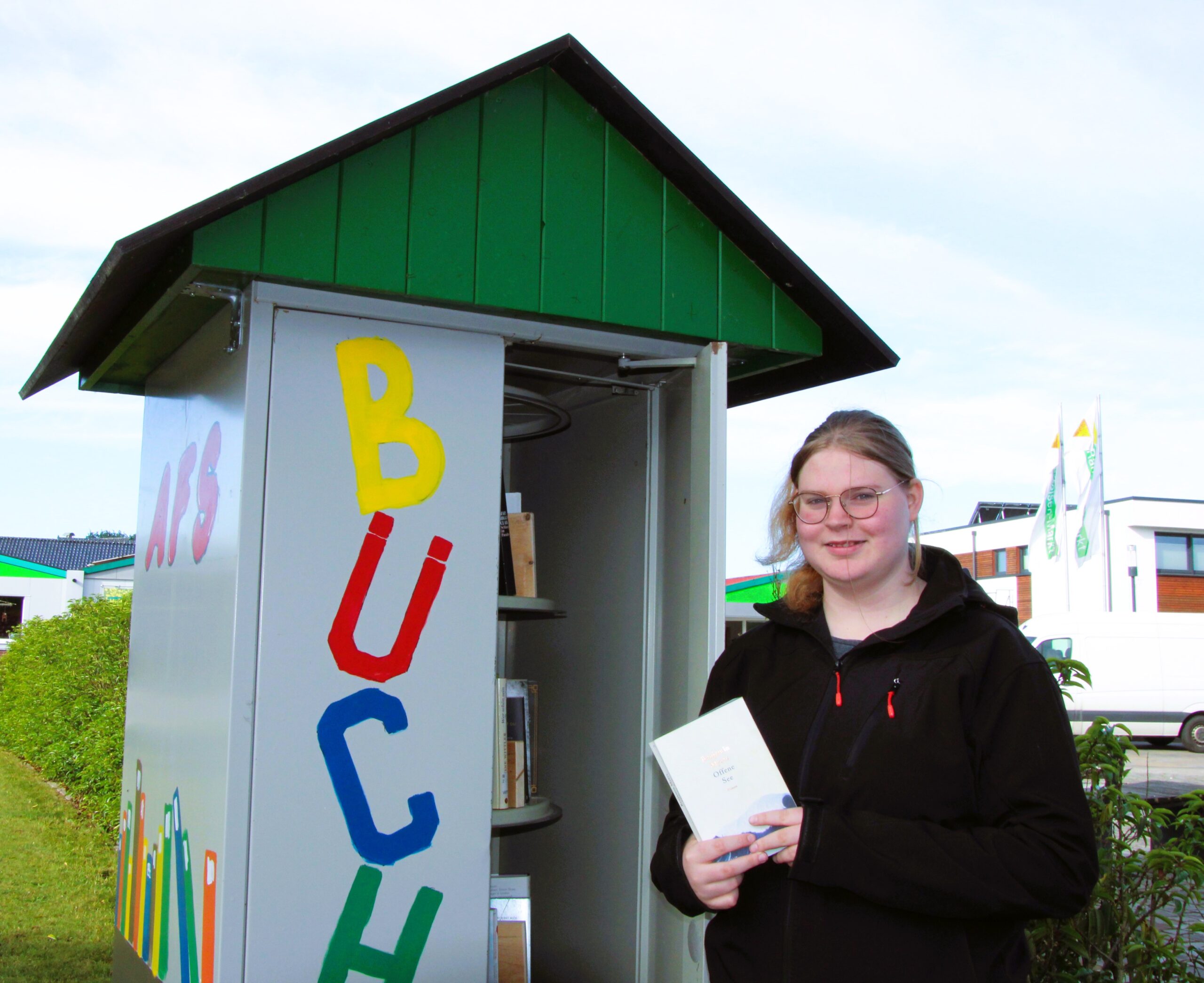 In der Projektzeit 10 „Herausforderung-Das Ehrenamt“ hat die Schülerin Lilith Roos sich dazu entschieden einen Bücherschrank für die Gemeinde Molbergen zu gestalten und diesen ehrenamtlich zu betreuen. Sie hat in den letzten Monaten mit Herrn Unnerstall von der Gemeinde Molbergen verhandelt, wo dieser Schrank stehen kann und gemeinsam hat man sich auf die Suche nach einem geeigneten Schrank gemacht. Ein alter Aktenschrank wurde gefunden und dieser bekam mit Hilfe der Hausmeister der AFS eine Dach. Lilith hat zusammen mit ihrer Schwester die Außenfassade vom Schrank gestaltet und in den letzten Monaten Bücher gesammelt. Nun wurde der Schrank vom Bauhof der Gemeinde aufgestellt und Lilith konnte den Schrank mit ihren Büchern bestücken. Schnell stellte sie fest, dass auch schon andere Gemeindemitglieder Bücher dazugestellt haben und auch schone einige Bücher in den letzten Tagen ausgeliehen wurden. Wir wünschen uns, dass dieser Bücherschrank rege genutzt wird und damit ein kleiner kultureller Beitrag für die Gemeinde Molbergen geschaffen wurde.