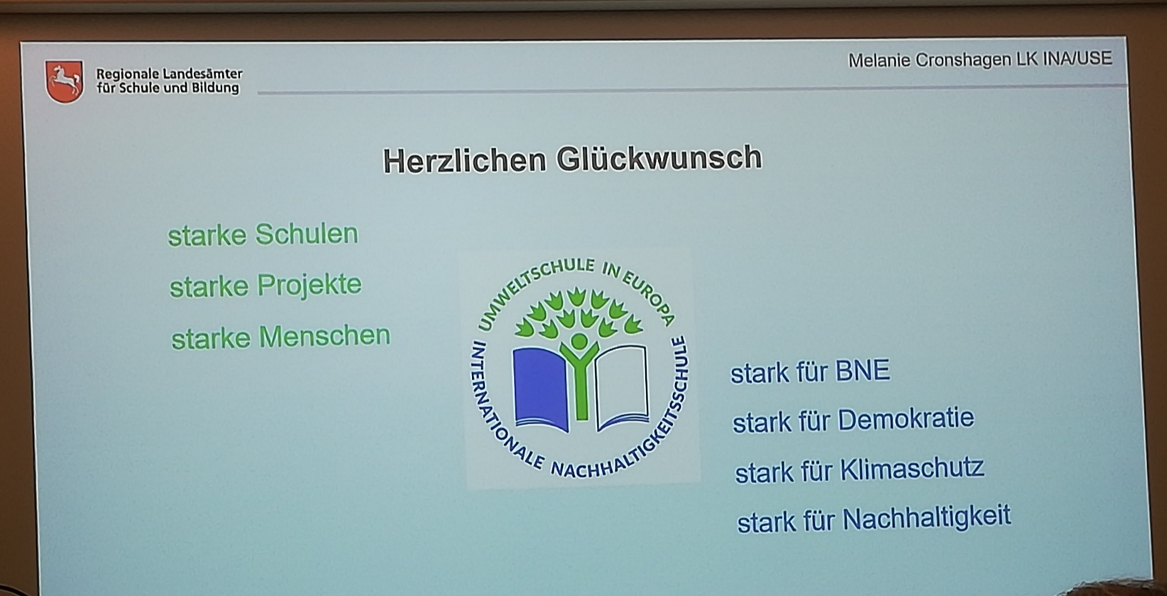Zum 8. Mal wurde unsere Schule als Umweltschule in Europa durch das Niedersächsische Kultusministerium ausgezeichnet. Wir haben uns in diesem Durchgang von 2022 bis 2024 mit den Bereich „Mobilität“ und „Brücken bauen in die Zukunft“ beschäftigt. Diese Themenbereiche gehören zu den Nachhaltigkeitszielen und sind durch unsere Projektzeiten, unsere WPK-Kurse Global Goals und unsere Fahrten mit dem Fahrrad zu den verschiedenen Berufsorientierungsplätzen, in den Schulwald und auf Klassenfahrten, um nur einige zu nennen, etabliert und kein einmaliges Projekt sondern ein gelebter Nachhaltigkeitsgedanke.