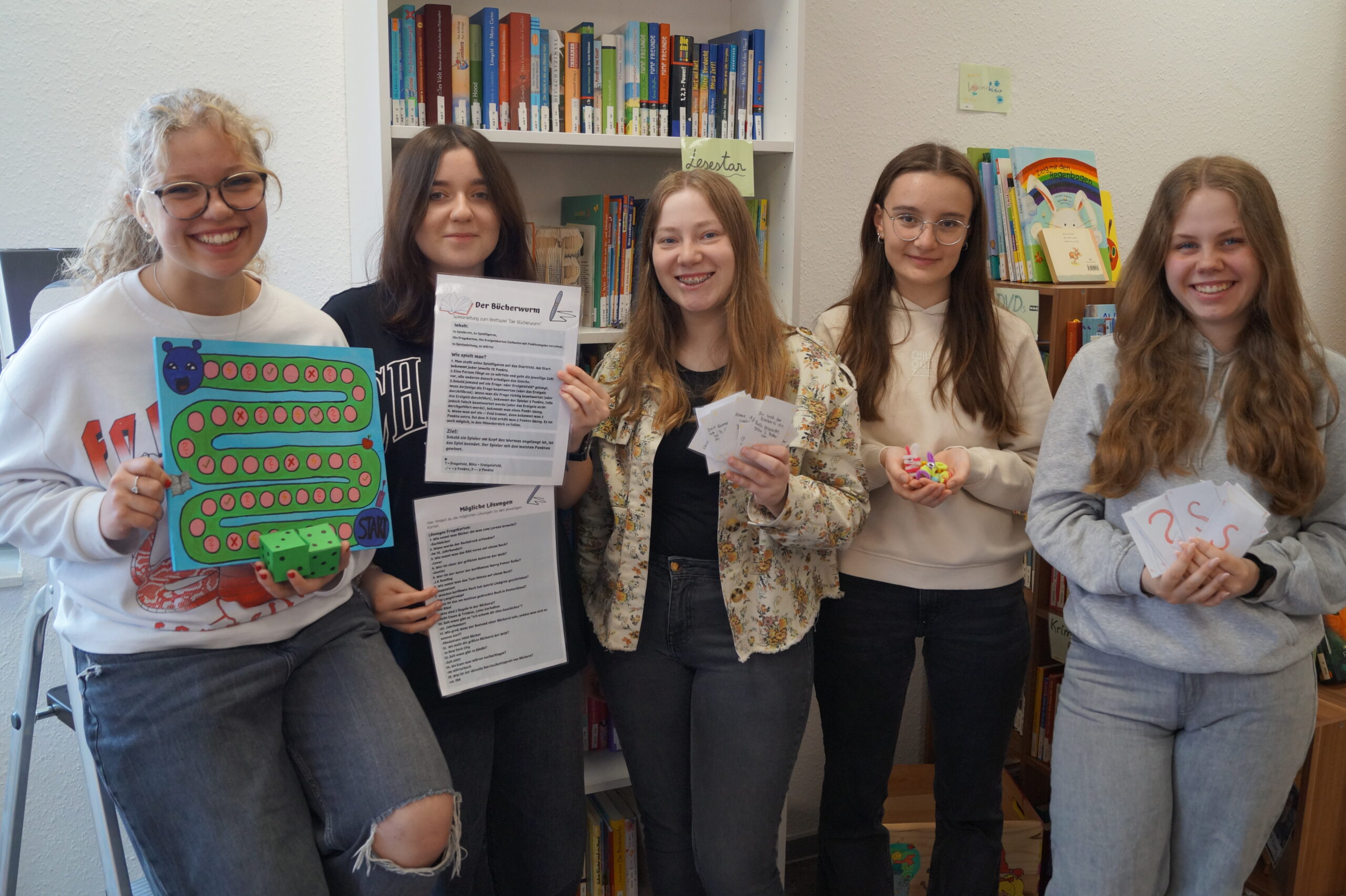 Schüler der Schülerfirma „Bücherkiste“ haben im Rahmen des Niedersächsischen Schulbibliothekswettbewerb 2024 Brettspiele entwickelt, die thematisch zur schuleigenen Bücherei passen. Sie entwarfen nicht nur das Spiel mit den dazugehörigen Regeln, sondern auch das Spielbrett und die Spielfiguren. Das Spiel „Der Bücherwurm“ (entwickelt von Angelina, Anna, Jenny, Marlene und Maya) wurde hierbei vom Niedersächsischen Kultusministerium, dem Netzwerk niedersächsischer Medien und der Akademie für Leseförderung Niedersachsen mit einer Urkunde und einem Sachpreis prämiert. Das Brettspiel „Mystery Games: Ausbruch aus Atazar“ liegt jetzt in der Bibliothek zur Ausleihe bereit.