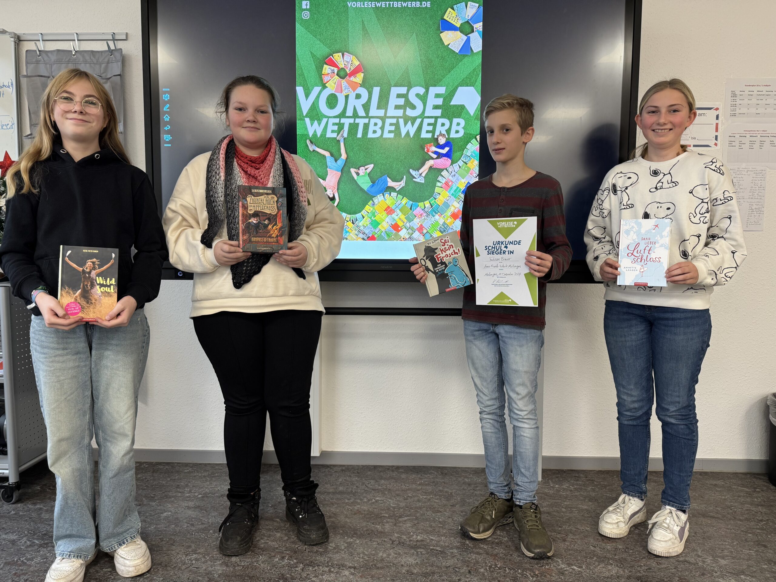 Auf dem Siegerfoto sind alle Klassensieger zu sehen: Von links nach rechts Janne Meyer (6a), Zofia Jeziorska (6b), Fabian Brauer (6d) und Maja Kryszon (6c). Herzlichen Glückwunsch an alle Teilnehmerinnen und Teilnehmer sowie insbesondere an unseren Schulsieger Fabian!