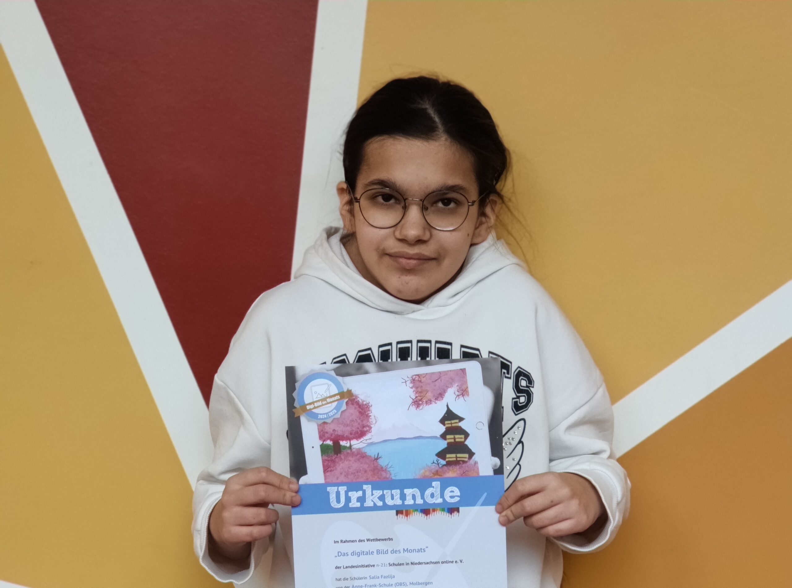 Unsere Schülerin Salia Fazlija hat bei dem Wettbewerb mitgemacht. Ihr am Computer gemaltes Bild ist für den Monat Januar ausgewählt worden. Damit wird dieses Bild im Kalender von N-21 am Ende des Jahres erscheinen. Herzlichen Glückwunsch. Die Urkunde und der Geldpreis für die Schülerin und die Schule sind bereits angekommen. Herzlichen Glückwunsch.