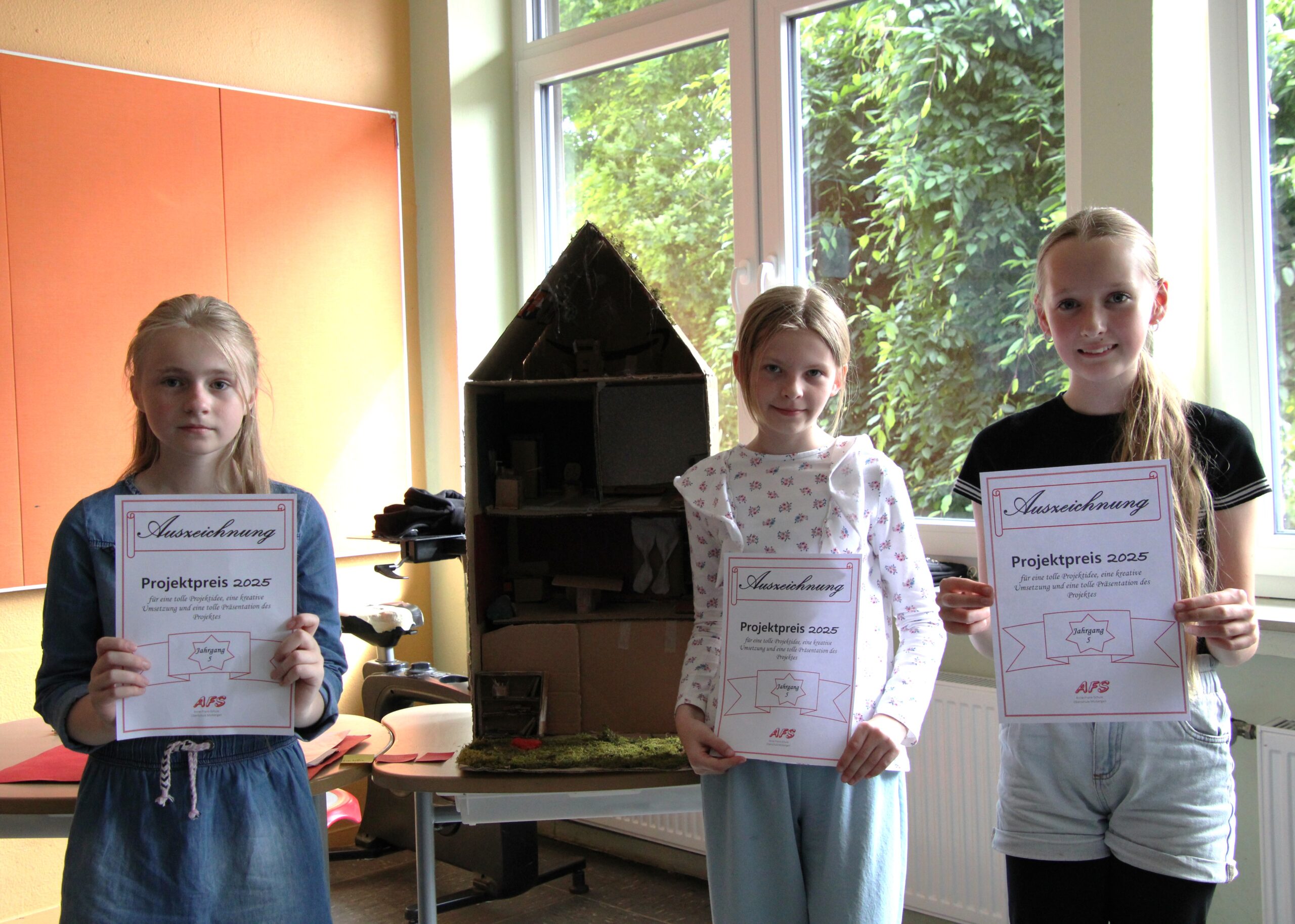 Die Jüngsten hatten sich mit Anne Frank, unserer Namensgeberin und der Zeit des Nationalsozialismus beschäftigt. Die Schüler aus Jahrgang 5 hatten unter anderem Miniaturhäuser und Präsentationen zu Schlachten des Zweiten Weltkriegs angefertigt. Jahrgang 6 brachte Bewegung auf das Schulgelände. Unter dem Motto „Schule in Bewegung“waren Ideen zum Lernen bei und mit körperlicher Aktivität entwickelt worden. Jahrgang 7 nahm sich des Themas „Nachhaltigkeit“ an. Die Projekte reichten von Upcycling-Ideen über Plastikvermeidung bis hin zu Visionen für eine umweltfreundlichere Schule. Vieles davon war nicht nur gut durchdacht, sondern auch direkt umsetzbar. In Jahrgang 8 wurde es dann ganz praktisch: In der Berufsfelderkundung durften die Schüler nicht nur zusehen, sondern selbst anpacken. Eine Wand wurde tapeziert und man setzte Kartoffeln – wer wollte, konnte sich sogar „seine“ Kartoffelreihe aussuchen und beobachten, wie sie in den nächsten Wochen wächst. Jahrgang 10 fragte: Was bedeutet es, sich ehrenamtlich zu engagieren? Die Antwort gaben die Schüler selbst – in Form von Präsentationen über ihr Ehrenamt. Ob im Sportverein, in der Nachbarschaftshilfe oder beim Spendensammeln für Kriegsgräberpflege: Die Projekte zeigten, wie wichtig gesellschaftliches Engagement ist.