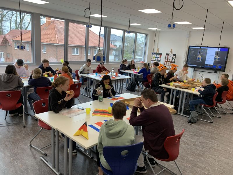 Der Schüleraustausch 2023 startete am 12.April. Die SuS aus Assen erreichten am Mittwoch mit ihren beiden Lehrkräften die Schule. Die Aufregung auf beiden Seiten war sehr groß. Nach dem gegenseitigen Kennenlernen gab es ein gemeinsames Mittagessen. Die Schüler:innen hatten sich eine leckere Pizza gewünscht. Im Anschluss daran fand die Besichtigung der Schule statt, bevor es auf eine Rallye durch die Gemeinde Molbergen ging.